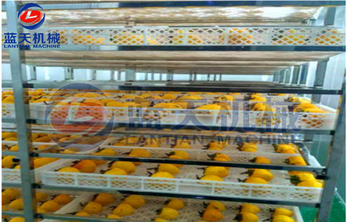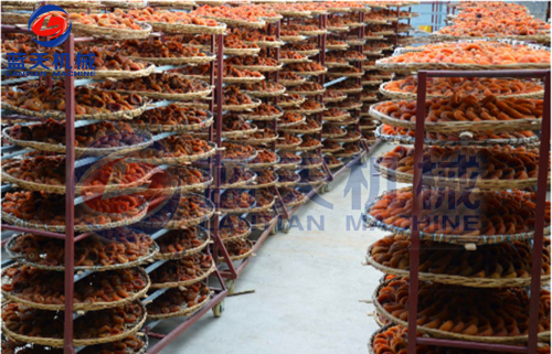 4:第一次烘烤 柿果進入柿餅烘干機后,迅速升溫至40——50°c,使柿果內(nèi)乙醇脫氫酶活性處于最高狀態(tài)。內(nèi)呼吸也加強,借以快速完成軟化,脫澀和部分脫水(25%左右),持續(xù)時間約12h,視柿果大小,成熟度靈活掌握。干燥柿餅時,防霉十分關(guān)鍵,稍有不慎,即會在幾個小時內(nèi)造成整個烤房中的柿果霉爛損失。因此,需要使烤房內(nèi)的相對濕度始中保持在70%以下,可有效防止柿果霉變。