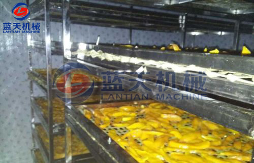2:芒果烘干前期需要經(jīng)過清洗,去皮,切片,烘干,抽真空包裝幾個程序,今天我們注意介紹烘干過程的溫濕度控制技巧,芒果片烘干的量一般比較大,兩臺12P主機(jī)構(gòu)成的烘干系統(tǒng),每批次可以處理2.5噸的新鮮芒果片,耗時30小時完成一批次干燥,系統(tǒng)時間分為5段完成,第一段55度,升溫,3小時,第二段60度,開始排濕,第三段62度,連續(xù)排濕,第四段58度,開始降溫排濕,最后一段55度,排濕鞏固。