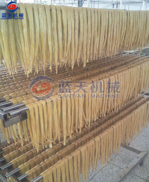第三步——蒸煮抄條,將豆?jié){加熱時,表面出現(xiàn)一層膜,即可將豆?jié){膜掛至竹竿上(此步稱為抄條),竹竿掛滿后轉(zhuǎn)移至烘車上。抄條時高溫操作注意操作人員人身安全。