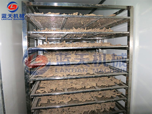 天麻蒸制后,先在烘干機或烘房內(nèi)烘至半干。烘干初期,溫度保持在50~60℃,并保持適當通風。以后每小時提高0.5℃,逐步提高至65℃。烘干初期若溫度過高,天麻容易出現(xiàn)糠心;溫度過低,通風不好時天麻容易變質(zhì)。若天氣晴好,也可日曬夜烘,降低烘干成本。