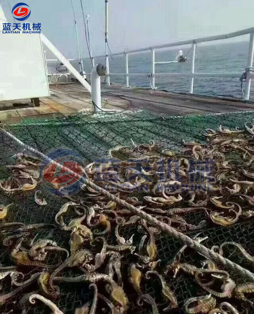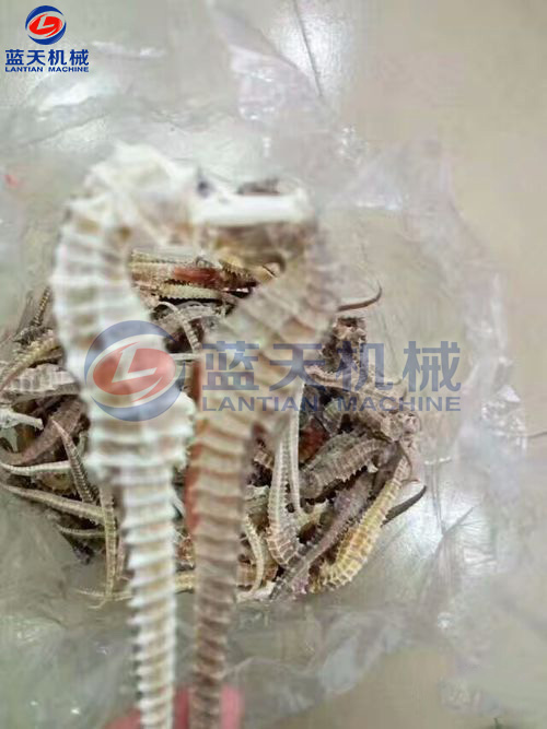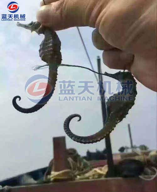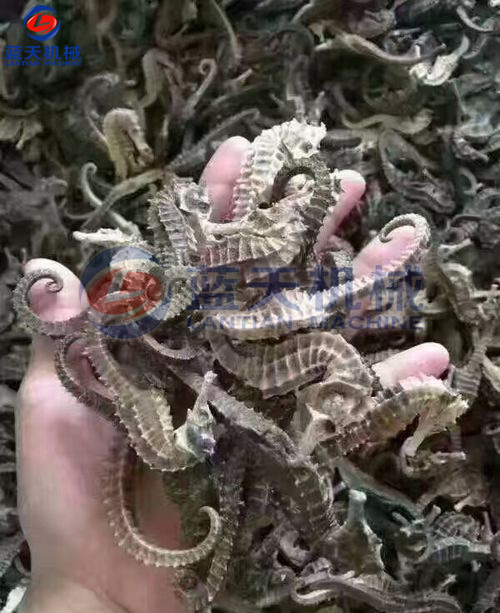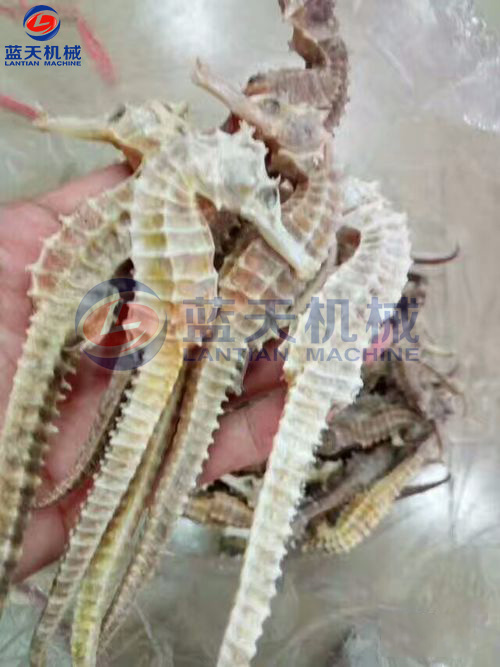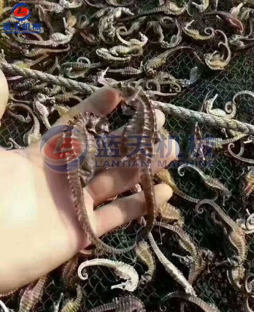 加工時.將海馬放在淡水中,清洗干凈,浸泡一段時間后,洗刷去體表灰黑色的皮膜,剖腹去掉內臟,將尾盤卷起,將處理后的海馬平鋪在物料網格盤中,插入物料推車隔層,將裝滿新鮮海馬的物料車推入烘干房,關閉烘干房密封門。
