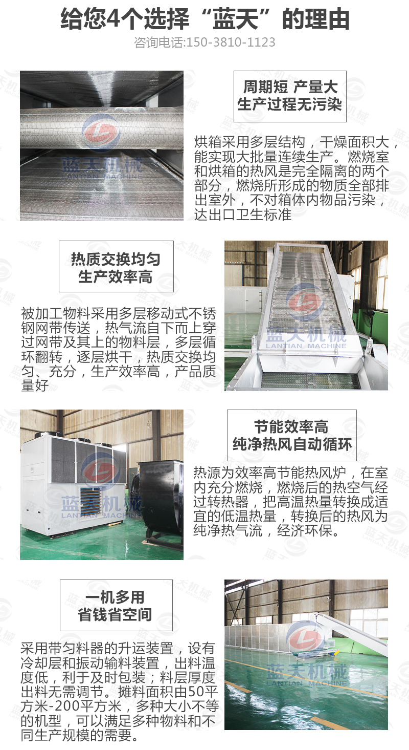 用大棗網帶烘干機烘干大棗不僅可以進行溫度上跟濕度上的智能化控制,也能保證紅棗本來品質的前提下進行內部水分蒸發(fā)和糖分轉化。同時全自動大棗烘干機可烘干的產量量大,烘干過程中沒有污染物排出,不僅保護了空氣,也讓烘干出來的大棗健康好吃。