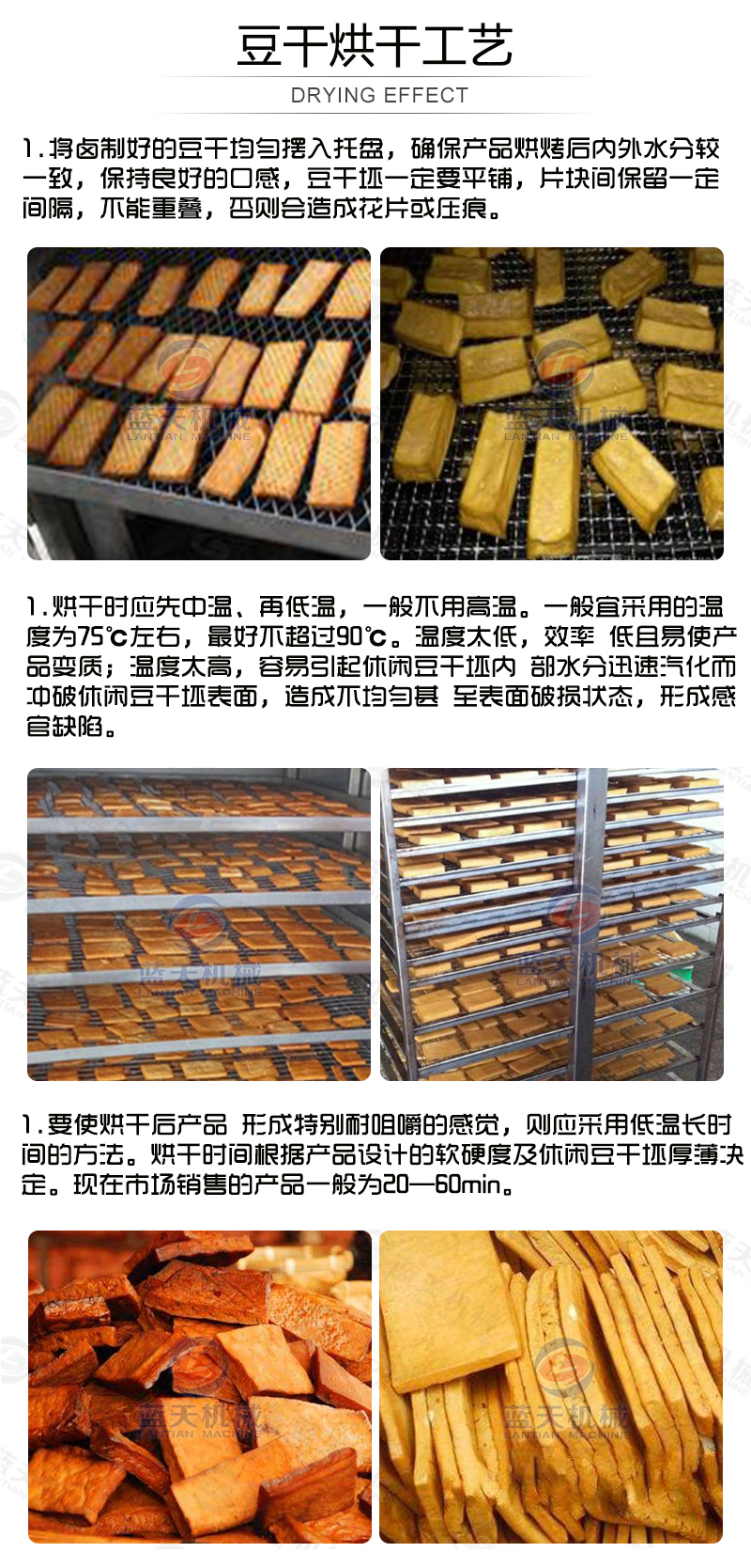 豆腐干坯要平鋪,片塊間保留適當?shù)拈g隔,不能重疊,否則會造成花片或壓痕。豆腐干烘干時,豆腐干烘干設備應先中溫、再低溫,一般不用高溫。一般豆腐干烘干機宜采用的溫度為85℃左右,不超過95℃。豆腐干烘干設備溫度太低,效率低且易使產(chǎn)品變質(zhì);溫度太高,容易引起豆干坯內(nèi)部水分迅速汽化而沖破豆干坯表面,造成不均勻甚至表面破損狀態(tài),形成感官缺陷。如果要使烘干后豆腐干形成特別耐咀嚼的感覺,豆腐干烘干機則應采用低溫長時間的方法。豆腐干烘干時間根據(jù)豆腐干設計的軟硬度及休閑豆干坯厚薄決定。