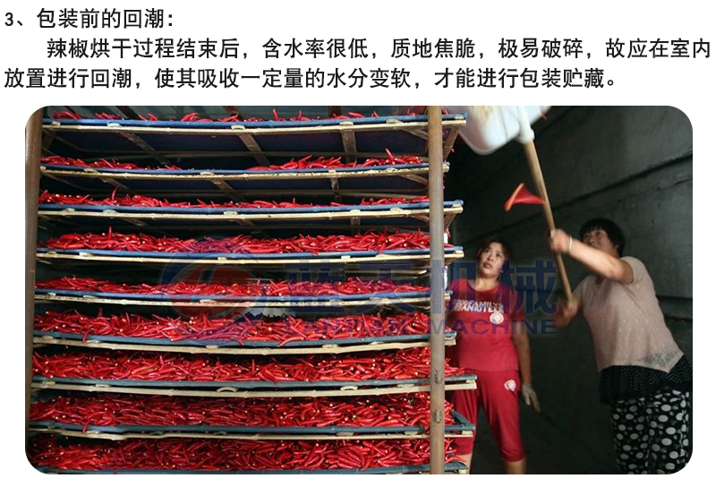 五:辣椒經(jīng)辣椒烘干機(jī)烘干后,選檢要在干辣椒自然回潮一段時間后進(jìn)行,否則干辣椒容易破碎;