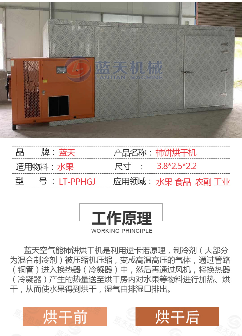 目前,國內(nèi)柿餅烘干加工工藝主要采取自然干制的傳統(tǒng)民間加工工藝。其主要流程為選果、去皮、日曬壓捏、脫色、捏曬整形、定型出霜然后包裝。由于自然干制的方法生產(chǎn)周期長,同時因長達(dá)數(shù)月的自然晾曬,微生物污染嚴(yán)重,因此產(chǎn)品的衛(wèi)生質(zhì)量差,自然干制還有占地多、用人多、用時長等缺點,我們對柿餅用熱泵烘干的進(jìn)行研究,有了柿餅烘干機(jī)的產(chǎn)生,并取得突破性的成果。